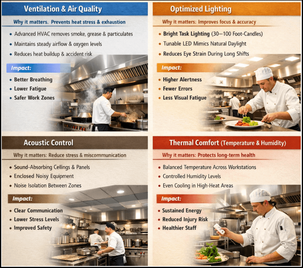 The physical environment of a kitchen plays a critical role in employee well-being. Designers now pay close attention to air quality, lighting, noise, and temperature to ensure staff remain healthy and alert. Refer to the image below for a visual overview of how air quality, lighting, acoustics, and thermal comfort are optimized in modern commercial kitchen environments.