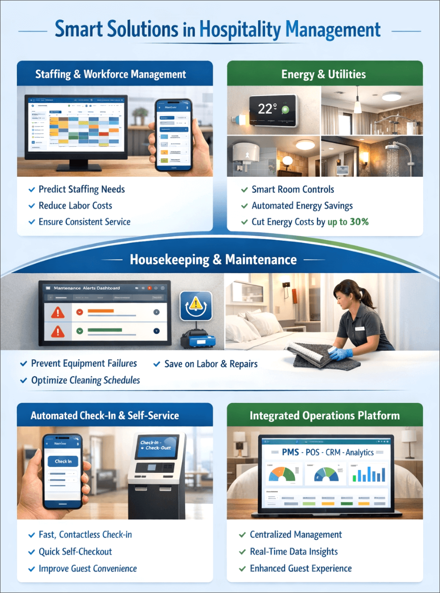 Smart technology helps hospitality businesses manage daily operations more efficiently. The image below highlights key solutions across staffing, energy management, housekeeping, and guest services, showing their impact on efficiency, cost reduction, and guest experience.